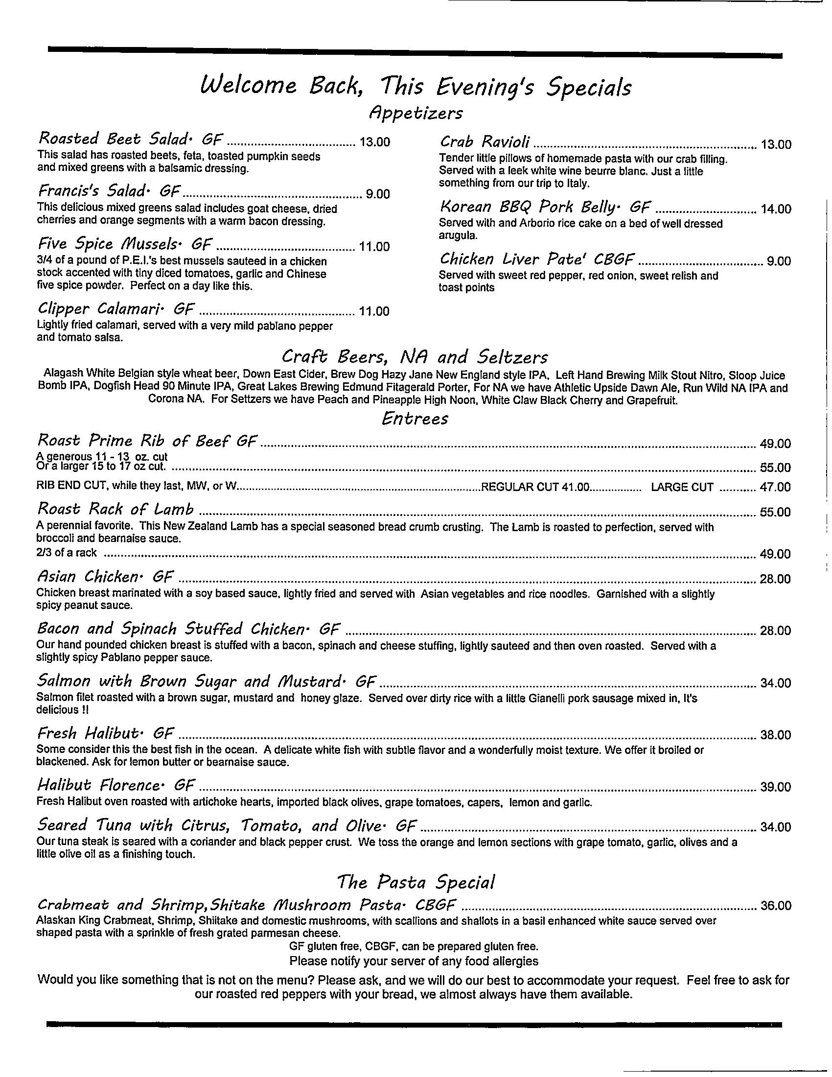The Clipper restaurant is closed for the season and will reopen in April. Below is an example of a typical special sheet at The Clipper.