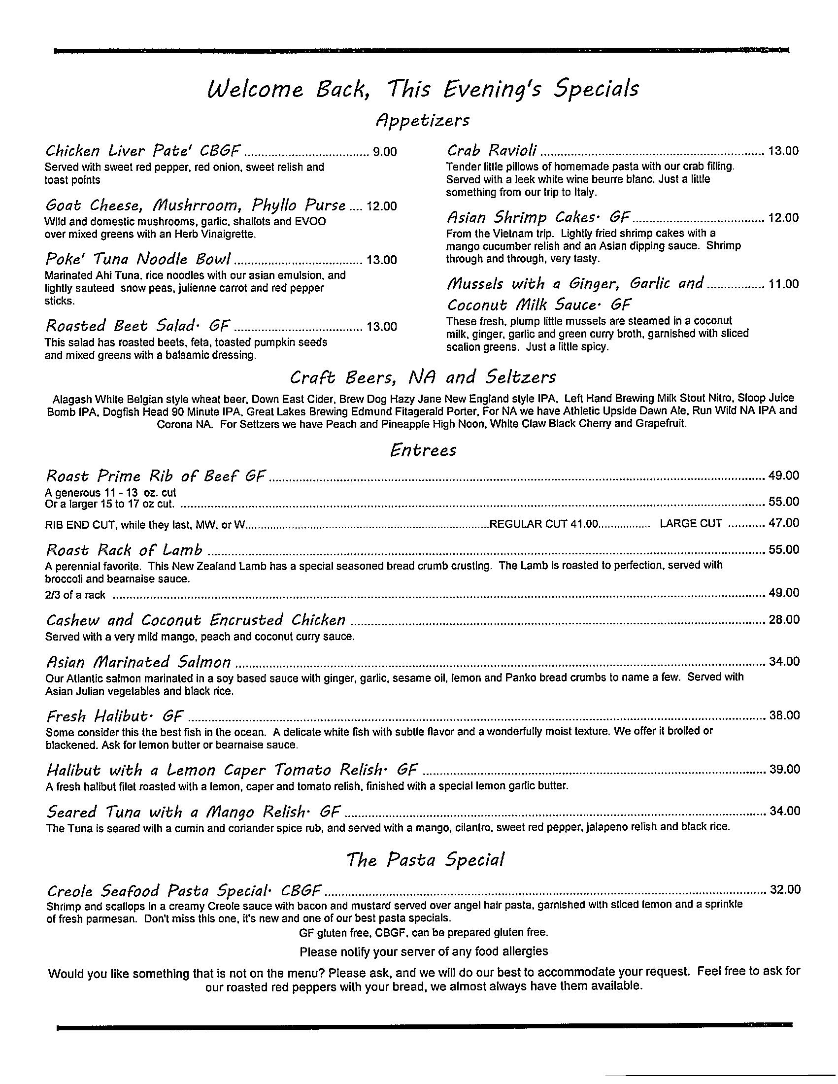 The Clipper restaurant is open, serving dinner Wednesday through Sunday. Below is a listing of this evening’s specials